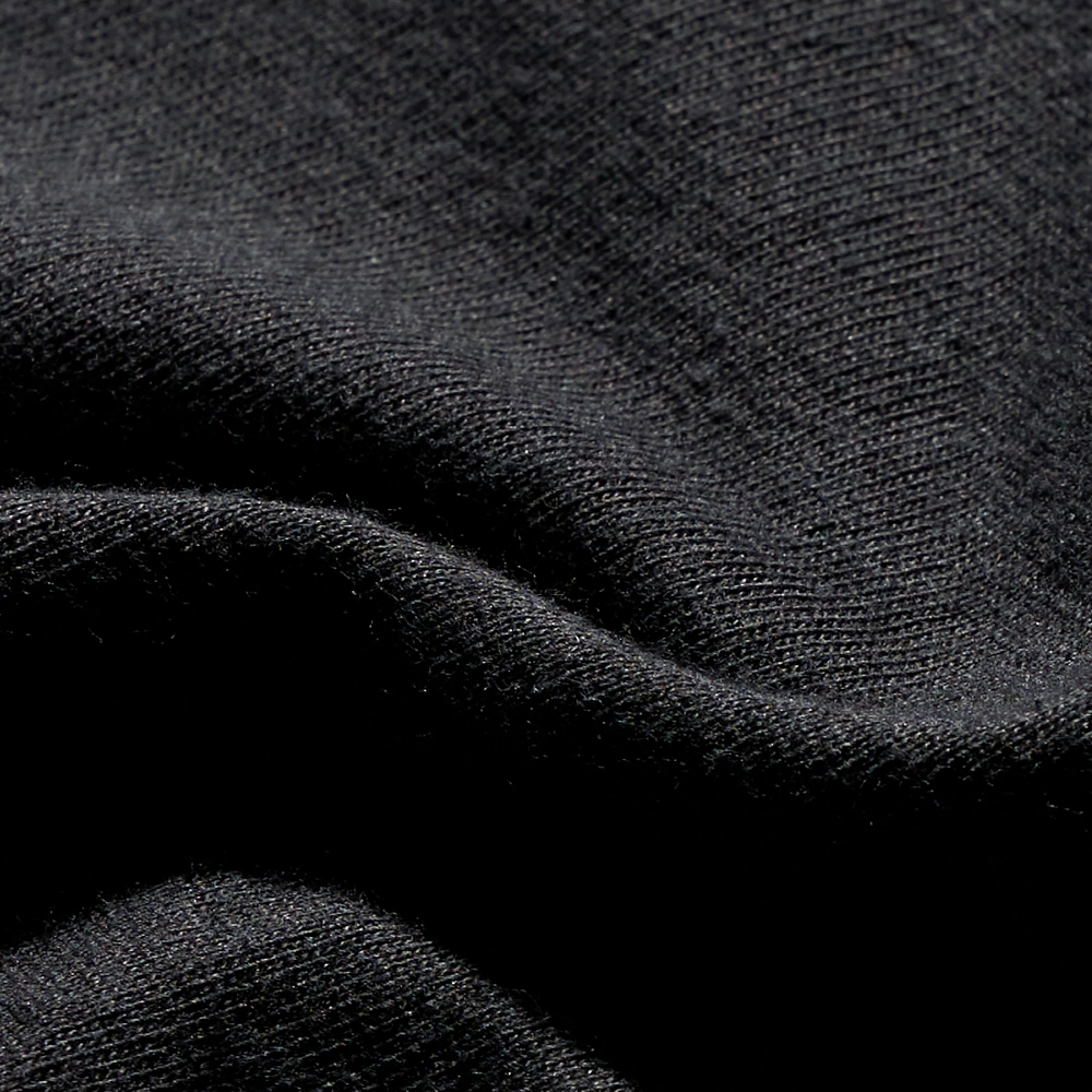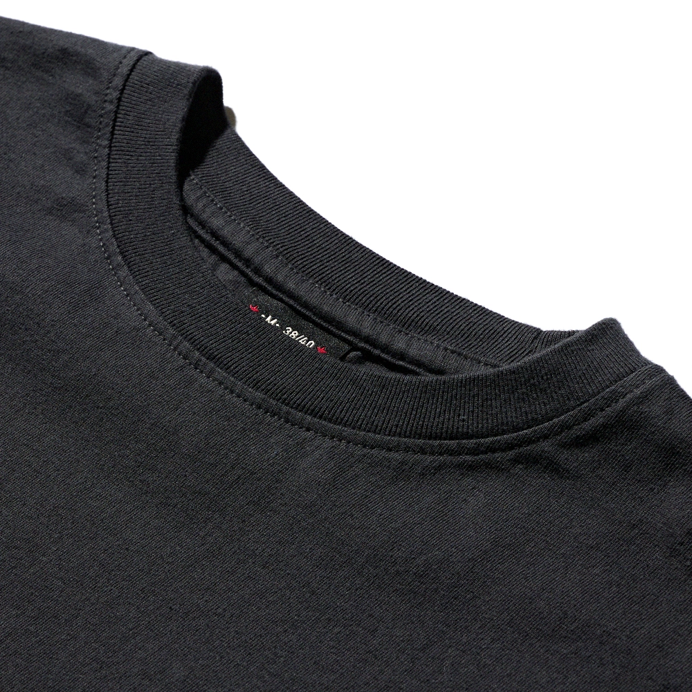 지속적인 착용 시 늘어지는 단점과 기타 문제점을 보완하기 위해 몸 판 내경과 넥 라인 리브와의 최대 마지 노선 등을 패턴으로 설정하고 그간 꾸준히 실제 샘플링 작업을 통해 완성할 수 있었습니다. 특히 어깨 전체 체인 스티치로 점철되는 방식을 탈피하면서 워싱 시 늘어나고 줄어드는 부분이 최소화 되도록 목 뒷부분만 폴더로 감싸 제작되었으며 마감 처리 역시 리브 안으로 말아 넣어 넥 라인 안쪽 내부 또한 깔끔하게 마무리되도록 작업을 진행했습니다.